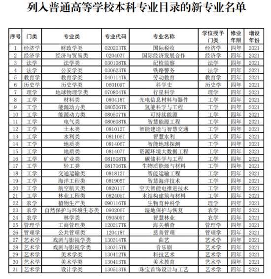 人民網(wǎng)北京2月24日電 (記者李依環(huán)、孫競(jìng))近日,教育部印發(fā)《關(guān)于公布2021年度普通高等學(xué)校本科專業(yè)備案和審批結(jié)果的通知》,新增1961個(gè)專業(yè)點(diǎn)、撤銷804個(gè)專業(yè)點(diǎn)。碳儲(chǔ)科學(xué)與工程、空天智能電推進(jìn)技術(shù)、生物育種科學(xué)、資源環(huán)境大數(shù)據(jù)工程、濕地保護(hù)與恢復(fù)、智慧林業(yè)、勞動(dòng)教育、科學(xué)史等31種新專業(yè)正式納入本科專業(yè)目錄。